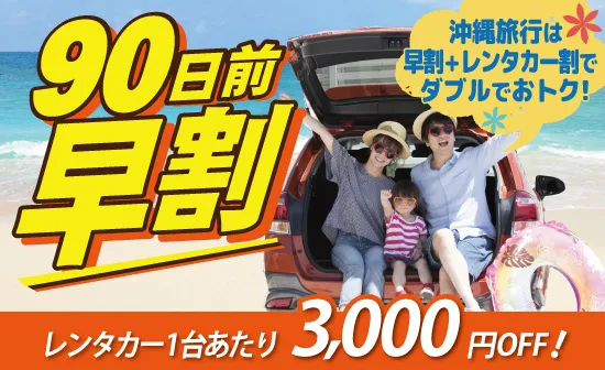 12月以降の沖縄旅行は、90日前までの早期予約で通常プランよりもおトクに予約しよう!早期予約限定で、レンタカー1台あたり3,000円の割引も適用できます!沖縄本島リゾート、那覇市内ホテルから1泊ずつホテルを選べます。
