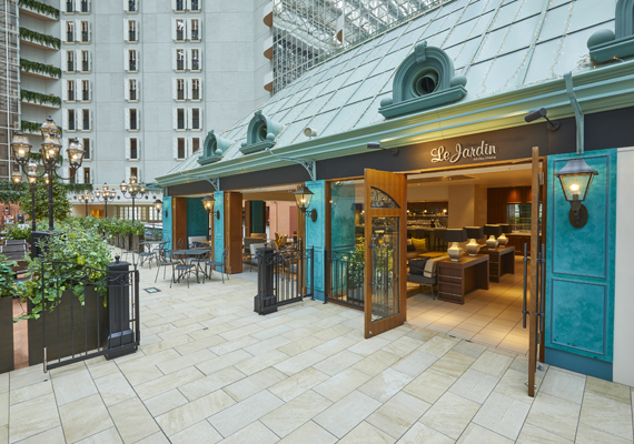 開放感あふれるアトリウム空間、東京ベイの景色が広がる海に面したエリアパフォーマンスキッチンやラウンジなどを併設し、南欧をイメージしたエリア最大級の客席数を有するレストランです。