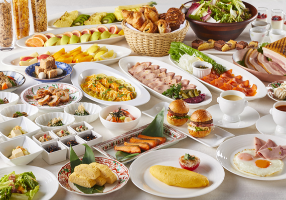 パフォーマンスキッチンの料理のほか、和食、冷製・温製料理、サラダバー、スープなどをご用意。品数豊富なホテル自慢の朝食ブッフェをお楽しみください。