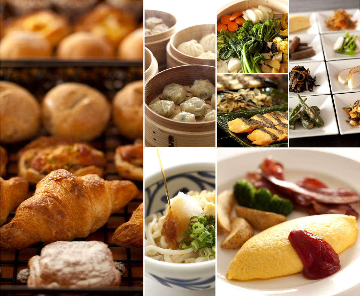 ホテルメイドの焼きたてパンにふわふわのオムレツ、蒸したての“点心”や契約農家からの野菜セイロ蒸し、パンケーキなど和・洋・中バラエティに富んだ選ぶ楽しさ満載のラインナップ。