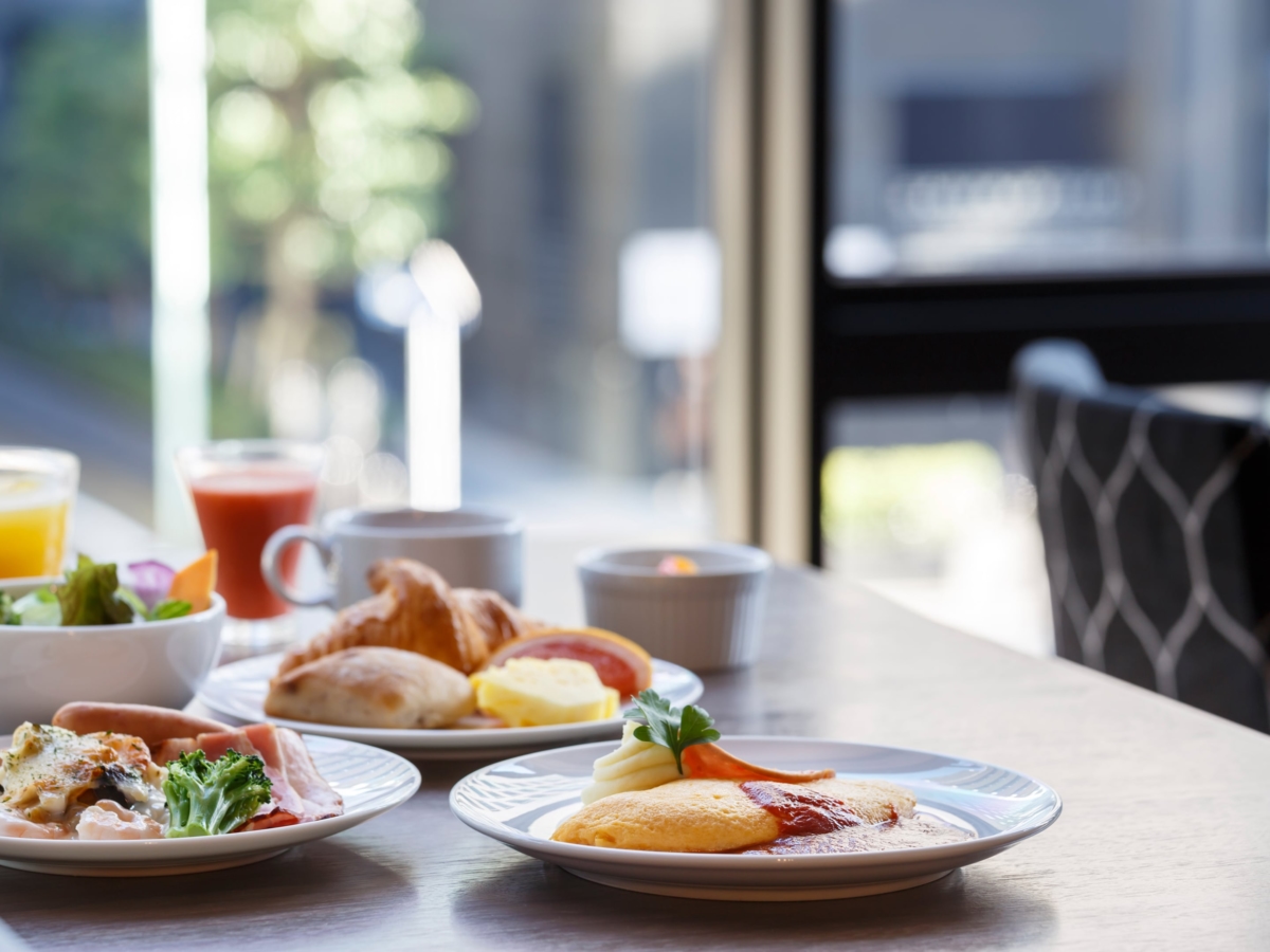 メインディッシュにデリやサラダ、スイーツなど約30種のハーフビュッフェがついた朝食をご用意しております。