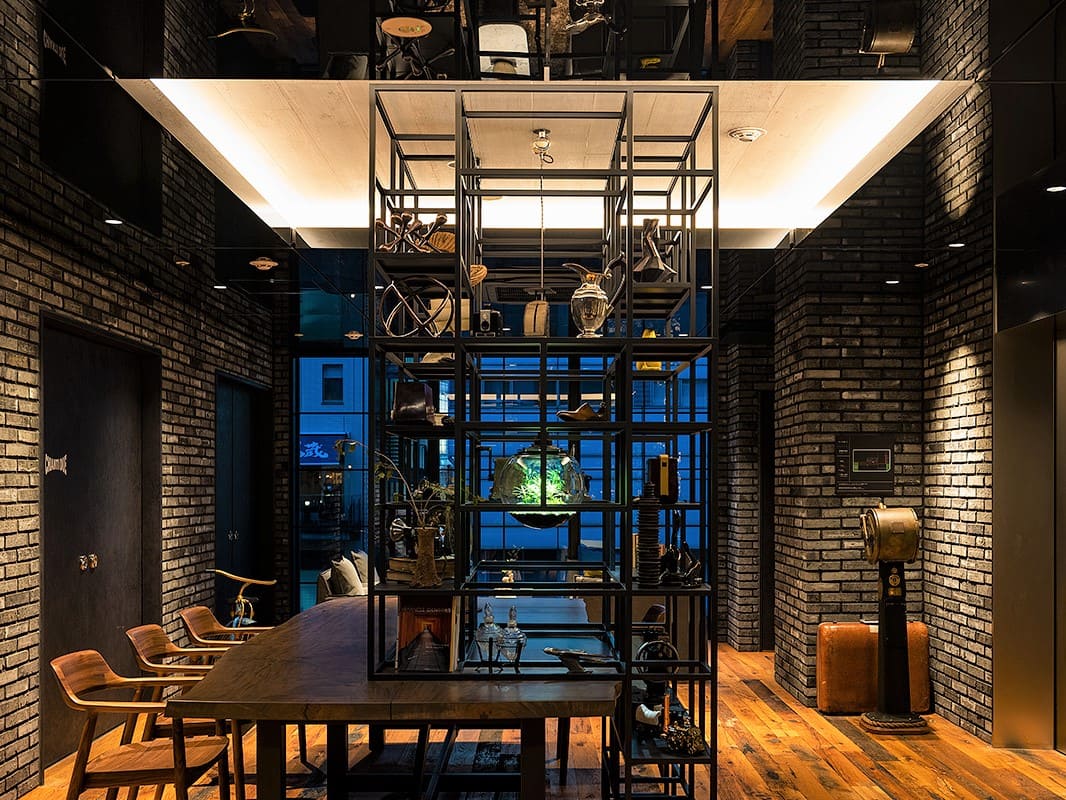 ニューヨークブルックリンをイメージしたリビングロビー。ラックには米国エマーソン社の美しい真空管ラジオや、米コダック社のストロボカメラが飾られています。また、アメニティはバイキング形式となっており、ロビーの一角に、歯ブラシなどの基本的なアメニティはもちろん、スキンケアセットや入浴剤、紅茶なども用意しております。