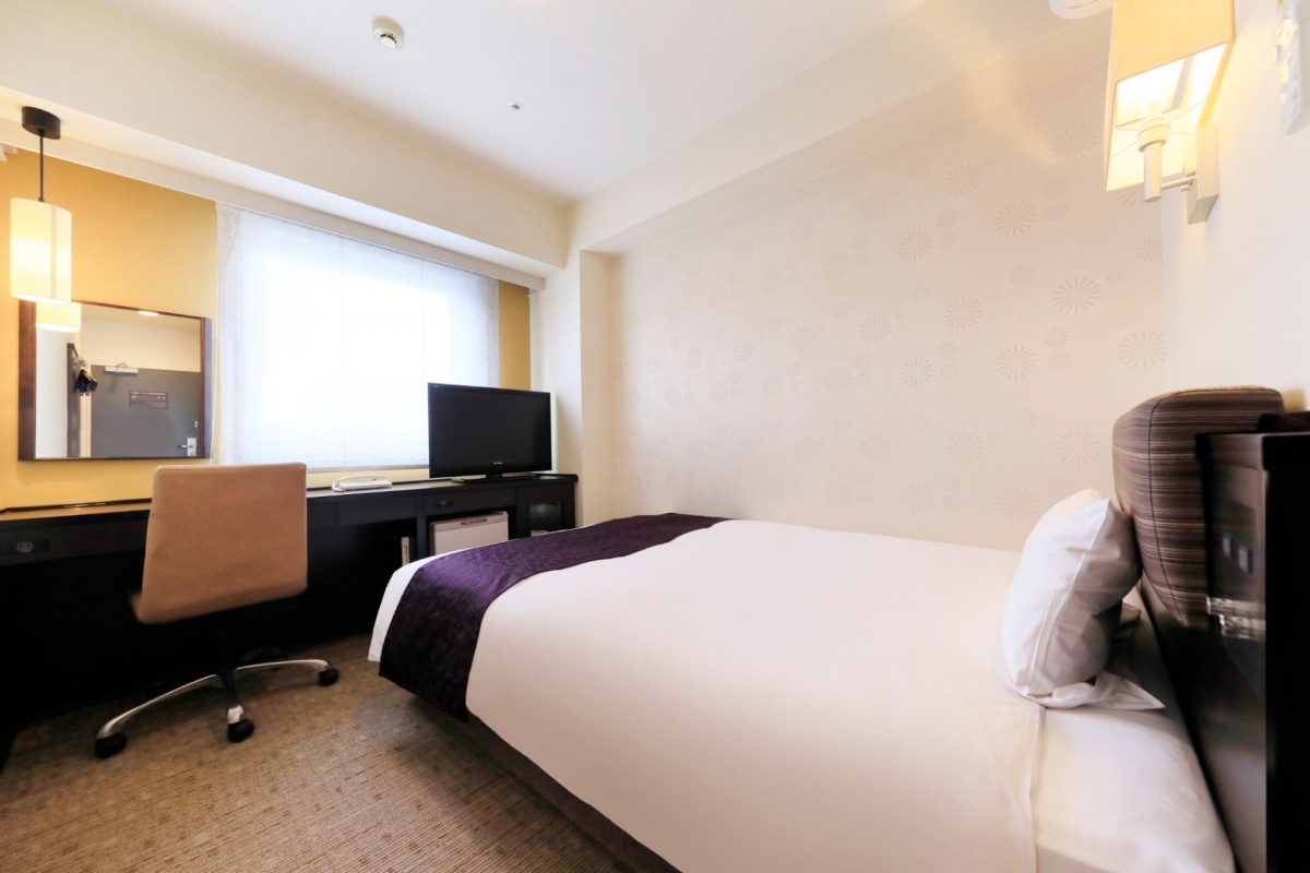 窓に面した広めのデスクをご用意しビジネス向けのシングルルーム。随所に加賀五彩の「黄土」を取り入れ、金沢らしさを表現しています。