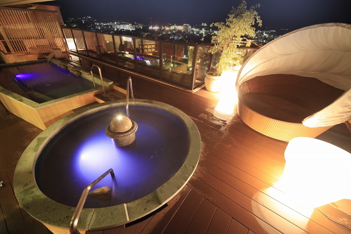 最上階にある客室露天風呂からは飛騨の小京都の町並みや飛騨の山々を眺めながら湯浴みをお楽しみ頂けます。