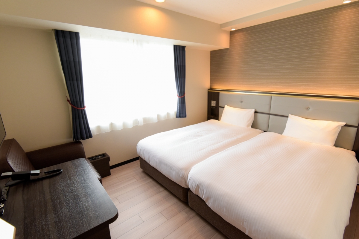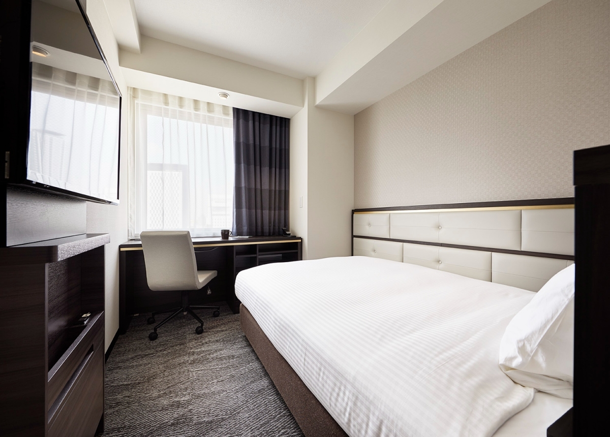 スタンダードな客室です。デスクがありビジネス向けの客室ですが140cm幅のベッドを採用していますので2名様でもご利用いただけます。