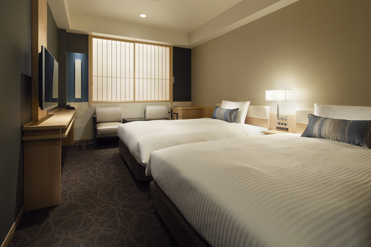 ゆとりあるソファセットとハリウッド仕様のツインベッドを配した客室です。京都の趣を感じる和モダンな雰囲気が特長の、スタンダードなタイプの客室です。※客室の窓は開閉できません。