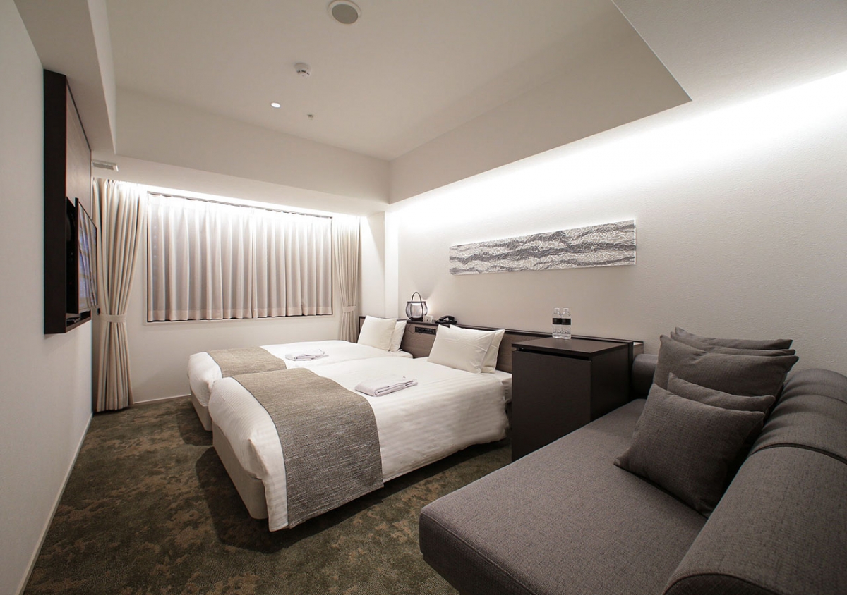 苔をモチーフにした絨毯の洋室タイプのハリウッドツインルーム。手前にはゆったりしたソファベッドを設置しています。提灯をイメージした照明器具を設置し、優しい灯りの中でゆっくりとお過ごしいただけます。