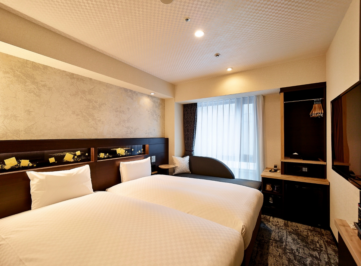 ヴィアインプライム京都駅八条口は、JR京都駅から徒歩2分。伝統技術「絹ガラス」(金彩工芸)を設えた空間で、京と出会うやすらいのときを。