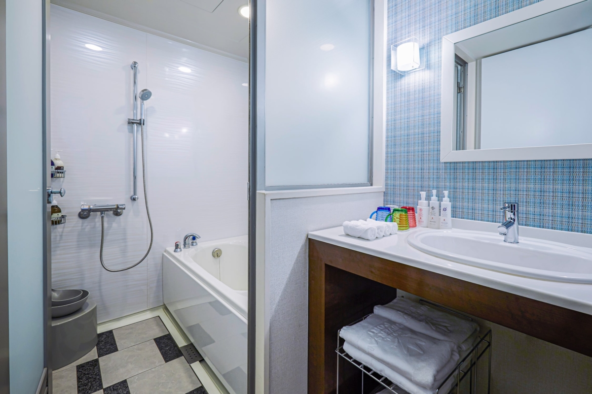 洗い場付きの広々バスルームで小さなお子様連れのお客様も快適バスタイム。