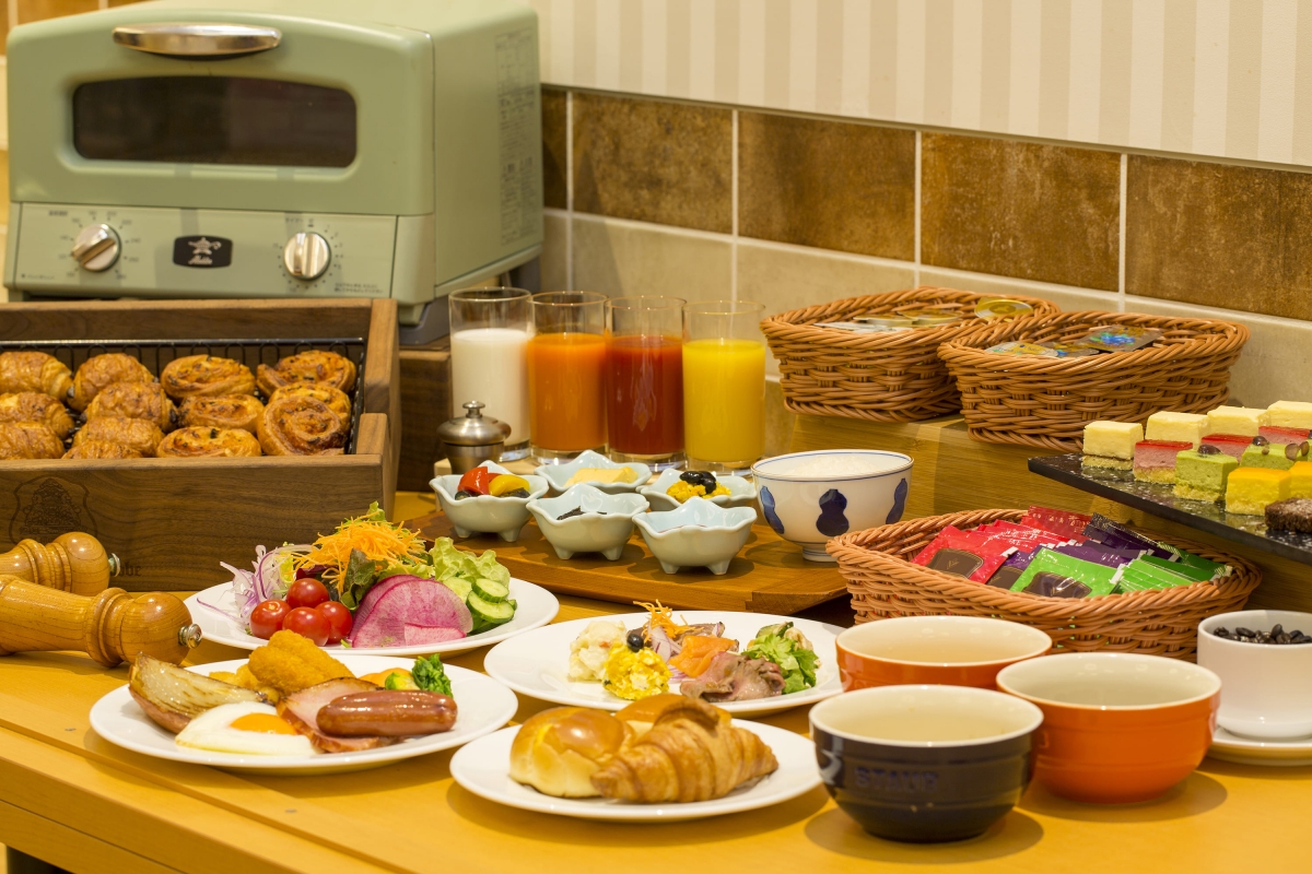 邸宅の大広間を思わせる空間で自慢の朝食を。焼きたてのパン、和食、サラダ、デザートなど数多くのメニューをブッフェ形式でご用意いたします。落ち着いた朝のひと時をお過ごしください。