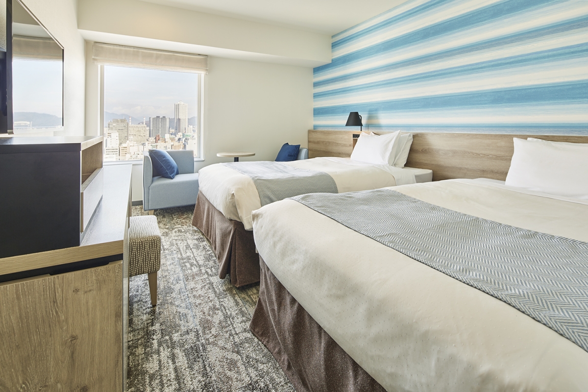 緑溢れる平和大通り沿いに立地し、市内観光・ショッピング・ビジネスに便利。朝食会場となるスカイレストラン「コフレール」からの眺望は抜群。北側はマウンテンビュー、南側は瀬戸内海に浮かぶ島々を一望できます。インテリアモチーフは、瀬戸内の海や地元の特産品。広島をより楽しんでいただける快適空間をご用意しました。