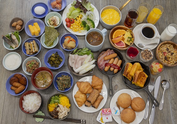 朝食はビュッフェスタイル。和惣菜に洋食、約50種類のメニューからお好きなものを。