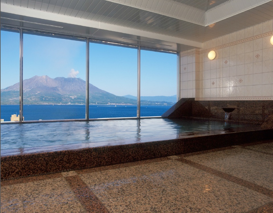 ホテル最上階(13階)にある桜島の全景が広がる天然温泉の展望大浴場で日頃の疲れを癒してください