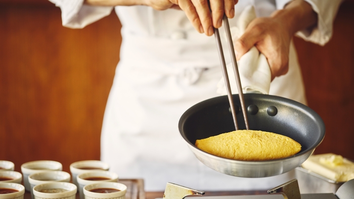 バターの香りが食欲をそそる、人気の特製オムレツのライブキッチンのコーナーでは、ふわとろのオムレツに、ホテルメイドの4種のソースをご用意。