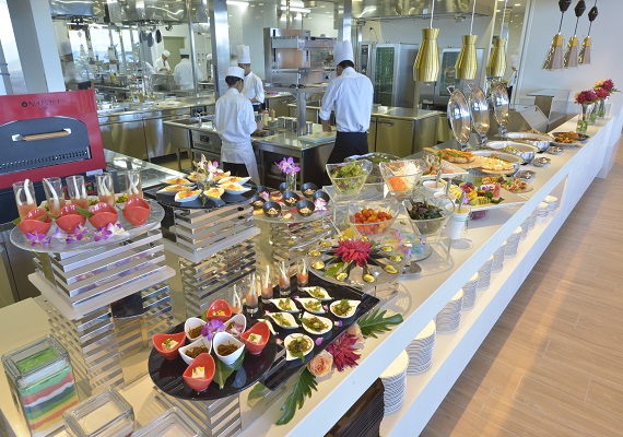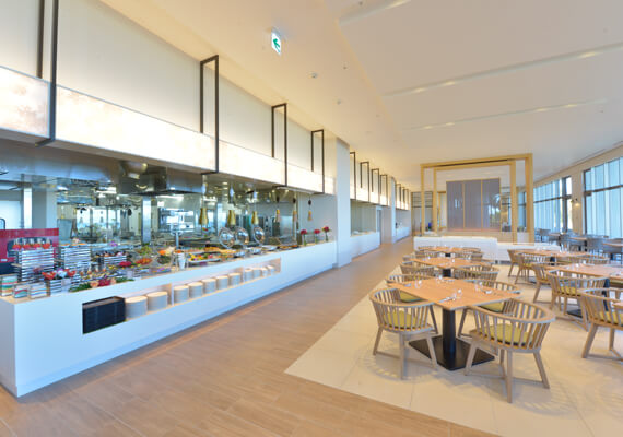 和・洋・中の料理をブッフェスタイルで楽しめるライブキッチンのレストラン。