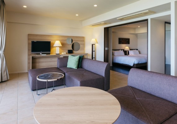 アネックス棟は一番新しい棟で、絶景を楽しめるインフィニティプールと焼肉レストラン「琉球BBQ Blue」が最上階に併設。正ベッドを最大4つ備え、68m²~79m²のゆとりのある空間を提供したお部屋でございます。