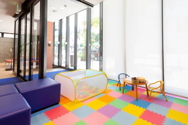 お子様に喜ばれるすべり台、ぶらんこも有り。また塗り絵、折り紙等をご用意しております。