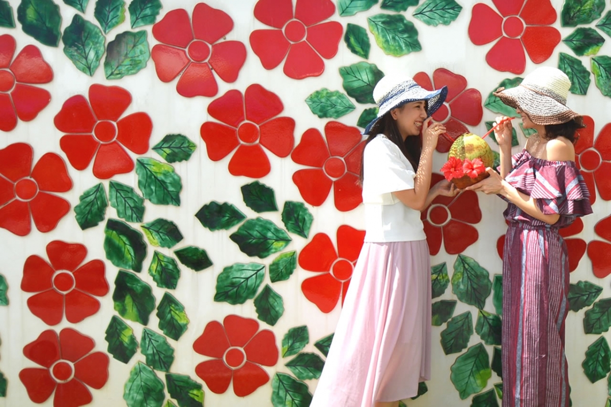 リゾート感たっぷりのガーデンプールは、全長70mという圧巻のスケール。プールサイドにはハイビスカスをモチーフにしたウォールアートも。お子様連れのファミリーやカップル、お友達とご一緒に楽しいひとときをお過ごしください。