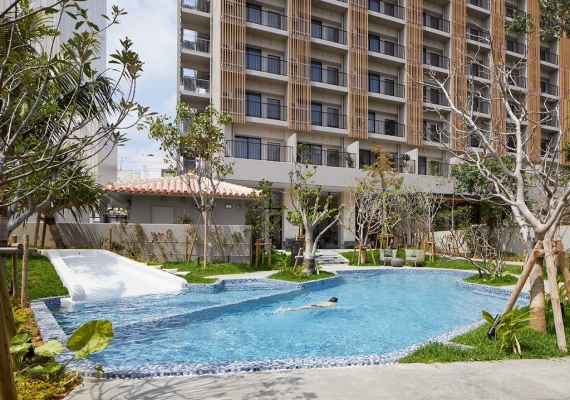 琉球の森をイメージした緑豊かな中庭には全長約14mの屋外プールと子ども用プールを設けています。