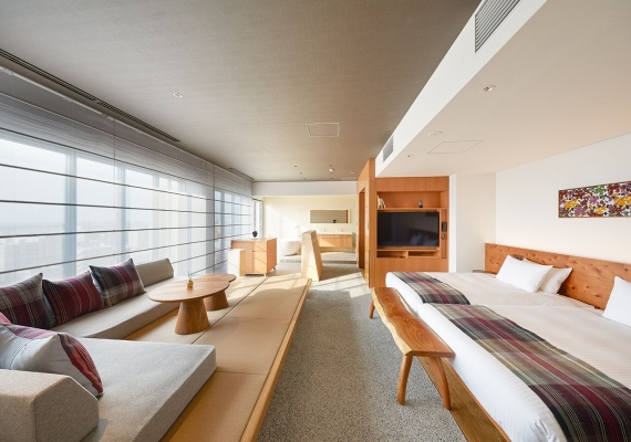 全客室の中で一番広いタイプのスイートルーム。ワイドな窓から海を望み、豊かな自然と屋外の雰囲気を感じられるデザイン。沖縄の工芸やアートが随所に散りばめられ、歴史や文化を感じられるSTRATAのコンセプトを体現したお部屋です。