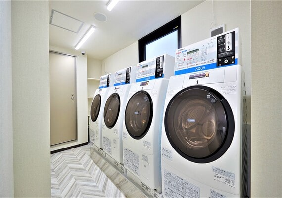 コインランドリーは最新式ドラム型で乾燥機一体式(ホテル2階)。洗剤は自動投入なので必要ありません。