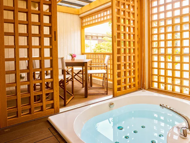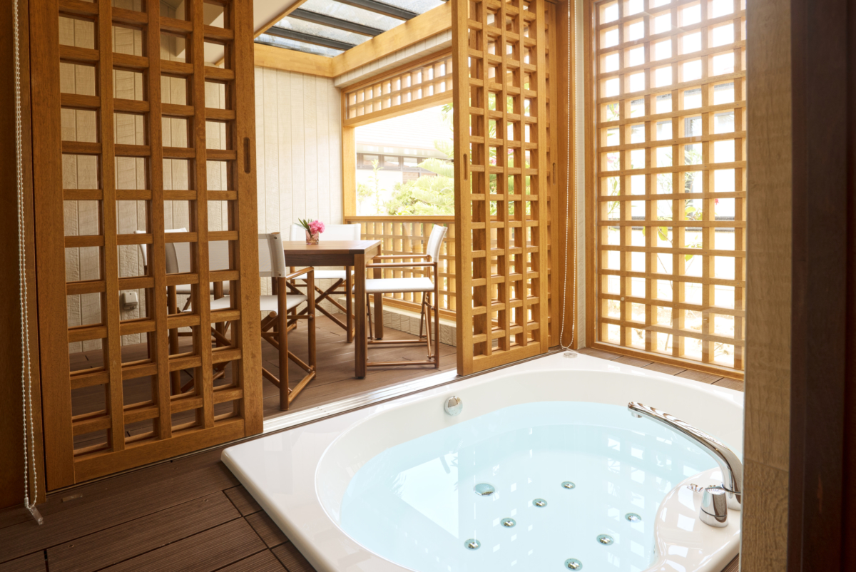 すべてのお部屋に、独立型シャワーブース、テラススペースにジャグジーバス、ウォシュレット付トイレを完備しております。