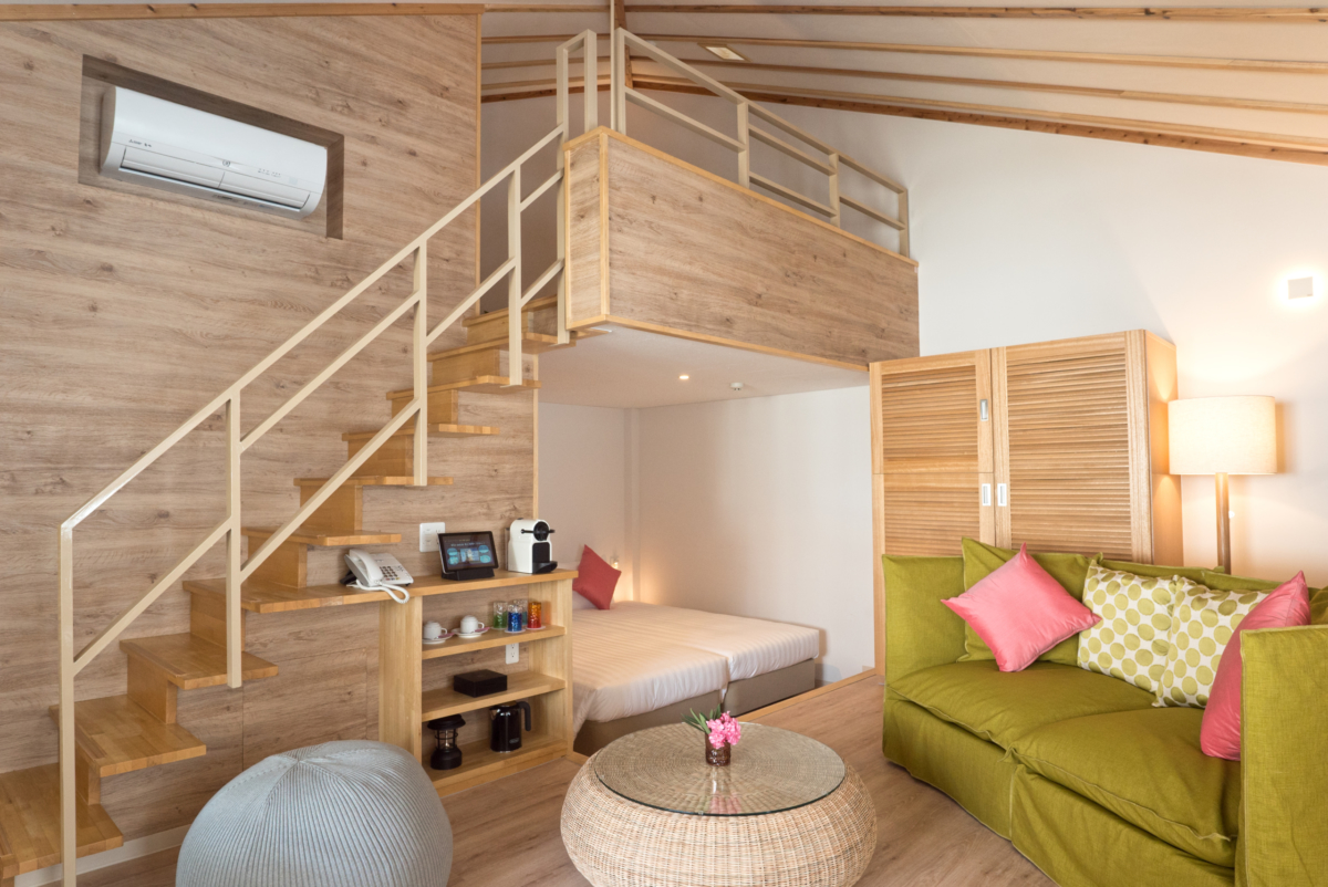 全室ロフトつきの遊び心いっぱいの明るい空間。中期滞在などに必要な設備もすべて取り揃えております。