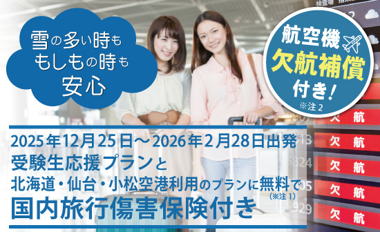 2025年12月25日~2026年2月28日に受験生プランと北海道・仙台・小松へご出発のお客様に国内旅行傷害保険付!