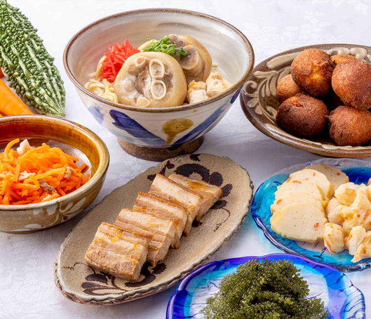 沖縄料理をメインに、旬の食材や地元の食材をふんだんに使用した和洋中メニューなど