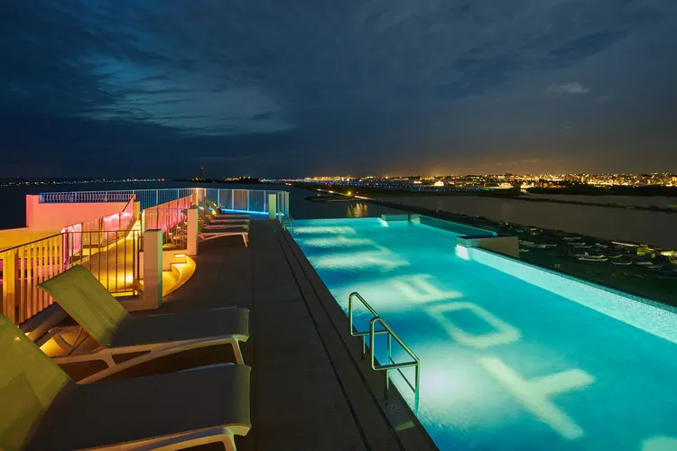 海と空に連なる8階のインフィニティプールでは、ふたつの滑走路に飛行機が離発着するダイナミックな風景を満喫できます。夕刻には空を美しく染めるドラマチックなサンセット。夜には那覇市街地のきらめく夜景を一望できます。
