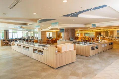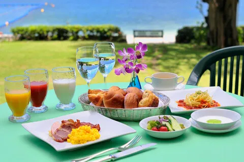 朝食会場のひとつ「シーサイドレストラン 谷茶ベイ」は、和洋食バイキングスタイルで、テラスでビーチを眺めながらの朝食も可能。卵料理とハム・ベーコンやパスタなど毎朝焼たてのクロワッサンなどが自慢の朝食(写真はイメージ)を是非ご賞味ください。